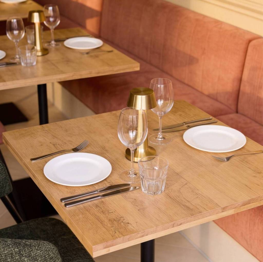 La table est le premier contact visuel du client avec votre univers. Sa matière parle avant même qu’on s’y assoie. Un plateau en bois massif huilé évoque la chaleur artisanale, l’authenticité d’un lieu qui dure. Un effet marbre blanc crème installe une élégance discrète et intemporelle. Un stratifié façon béton ou ardoise joue la carte industrielle et urbaine. Un plateau en chêne naturel avec des pieds en épingle métallique fine ? C’est tout de suite mid-century, rétro-chic, New York loft. La forme compte autant que la matière : les tables rondes adoucissent l’atmosphère et facilitent la conversation, les tables rectangulaires créent une certaine rigueur moderne, les tables carrées se prêtent à la modularité. Et en jouant sur les hauteurs, tables basses pour un coin lounge, tables hautes pour un espace bar ou brunch, vous créez des zones distinctes qui donnent du rythme à votre salle.