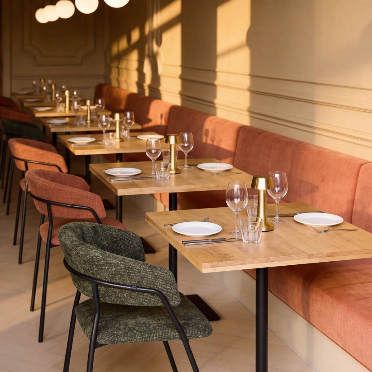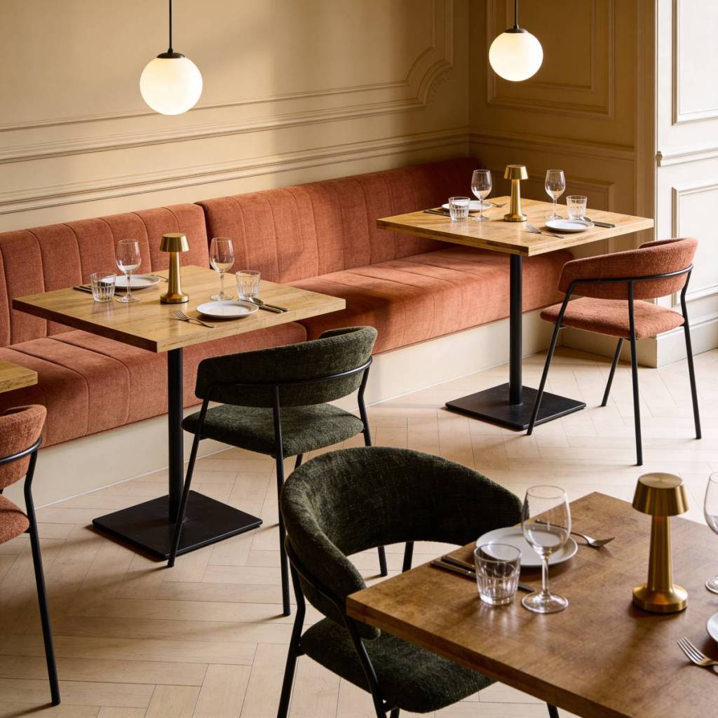 Il y a une raison pour laquelle les clients se ruent toujours sur les banquettes : elles offrent ce sentiment d’être installé pour de bon, ancré dans l’espace, protégé des regards tout en restant dans l’animation. En tissu texturé, en velours plissé, en simili cuir souple ou en bouclette tendance, elles sont aujourd’hui l’un des éléments décoratifs les plus puissants d’une salle de restaurant. Murales ou en îlot central, colorées ou dans les tons de la salle, les banquettes structurent l’espace autant qu’elles l’habillent. Associées à des tables rondes légèrement plus basses, elles créent des alcôves intimes très appréciées. Avec un éclairage suspendu juste au-dessus, elles deviennent de véritables scènes dans la scène.