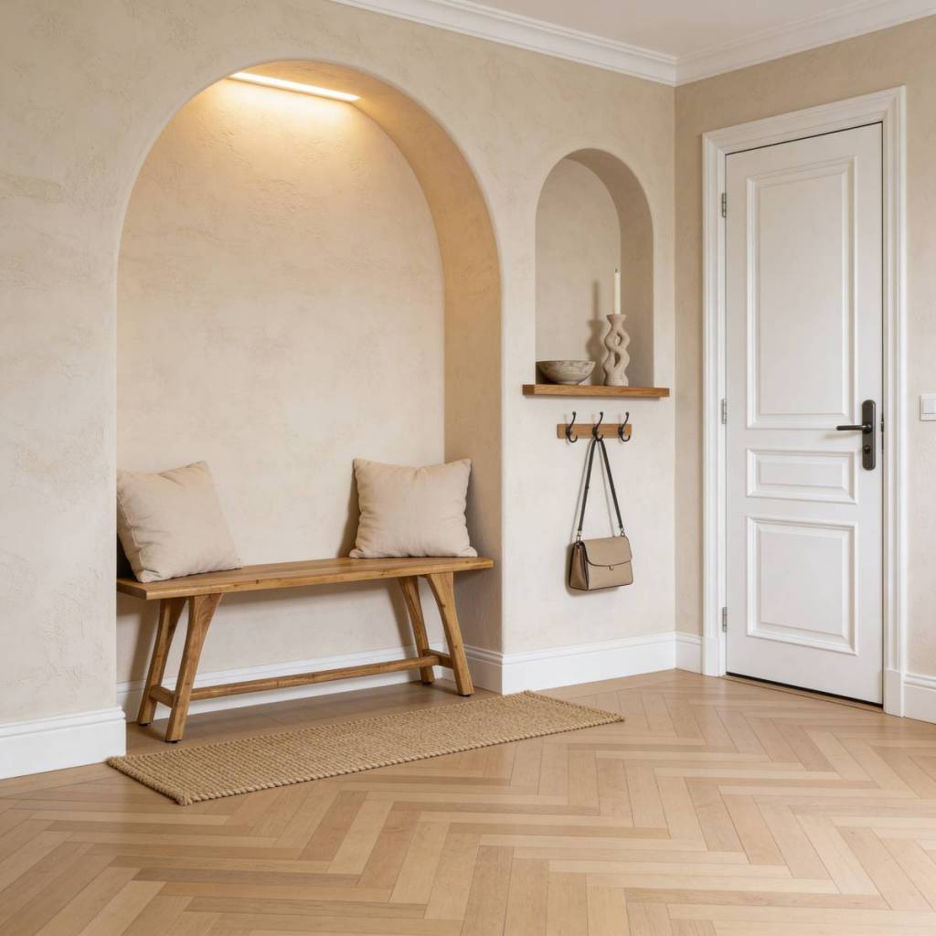 L’entrée est l’espace idéal pour intégrer une arche murale. Elle crée une première impression forte et donne immédiatement du caractère au lieu. Placée dans une niche ou dessinée directement sur le mur, l’arche murale accueille parfaitement une console. La console ou le banc devient alors un meuble central de l’entrée. Associée à une arche murale, elle gagne en présence et en élégance. Une console en bois apporte de la chaleur, tandis qu’un modèle aux lignes épurées renforce un style plus contemporain. L’arche encadre visuellement le meuble et structure l’espace, même dans une entrée de petite taille. L’ensemble peut être complété par un miroir, une lampe ou quelques objets décoratifs pour accentuer la profondeur et la verticalité du mur.