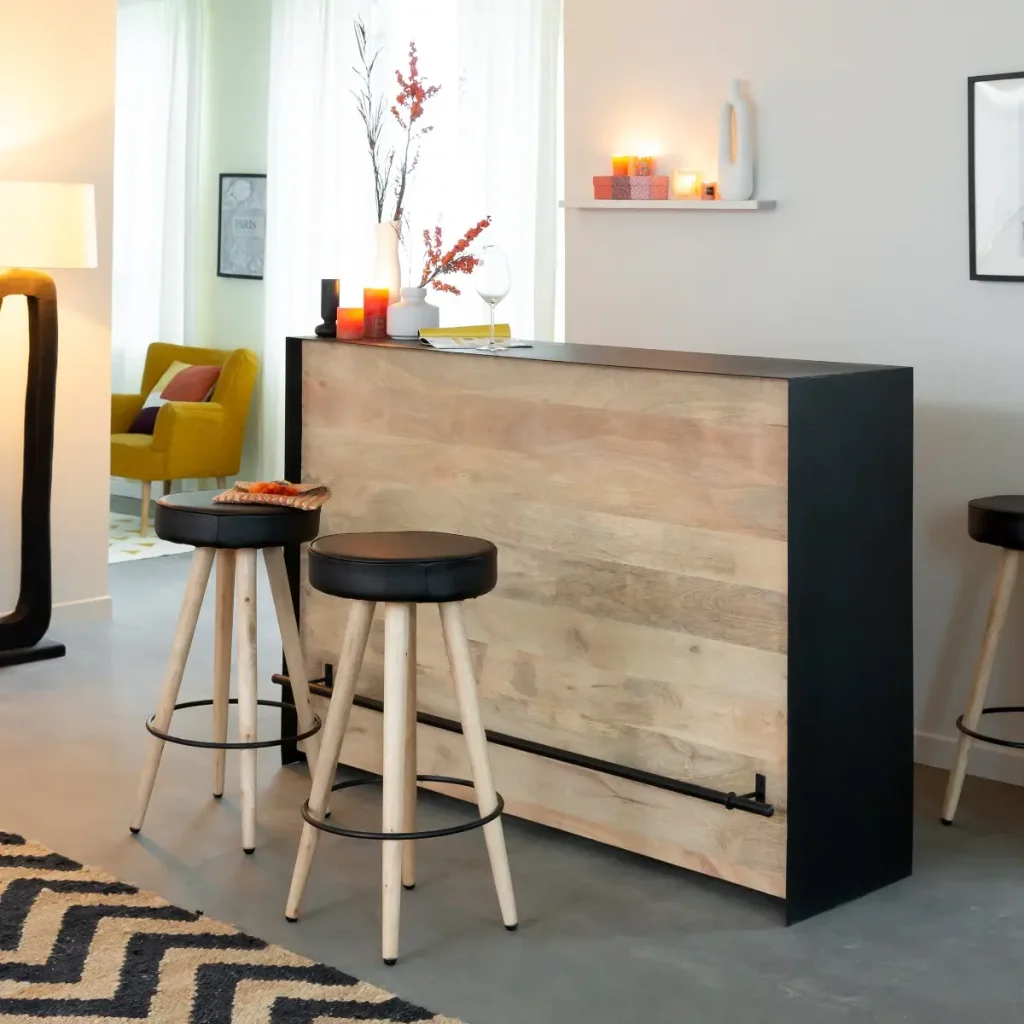 Voulez-vous un bar en bois plus traditionnel ou préférez-vous quelque chose de moderne comme l’acier inoxydable ? Le bois est disponible dans une variété de finitions, du manguier foncé au manguier clair, ce qui vous laisse le choix entre de nombreuses options. Les bars en acier inoxydable sont élégants et contemporains et peuvent facilement devenir le point central de tout espace de vie. Quel que soit le matériau que vous choisissez, il doit être assorti aux meubles existants ou aux éléments d’accentuation de votre maison pour un look cohérent