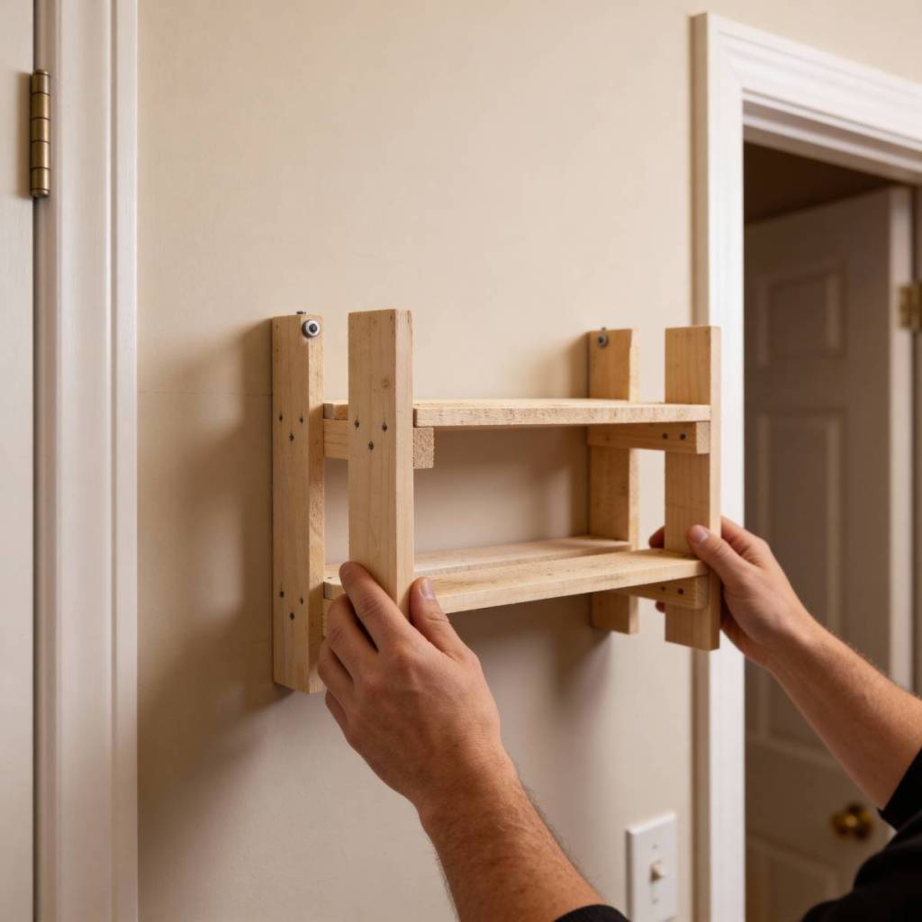 Installez les équerres ou tasseaux au mur en vérifiant l’horizontalité avec un niveau.