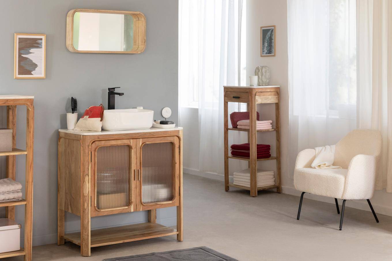 Sérénité des matières++++XSalle de bainSérénité des matièresSous le doux éclat du marbre, le bois d’acacia révèle sa chaleur. Ensemble, ils composent un espace apaisant où la nature dialogue avec l’élégance. Une harmonie simple et précieuse, reflet d’une sérénité authentique.
