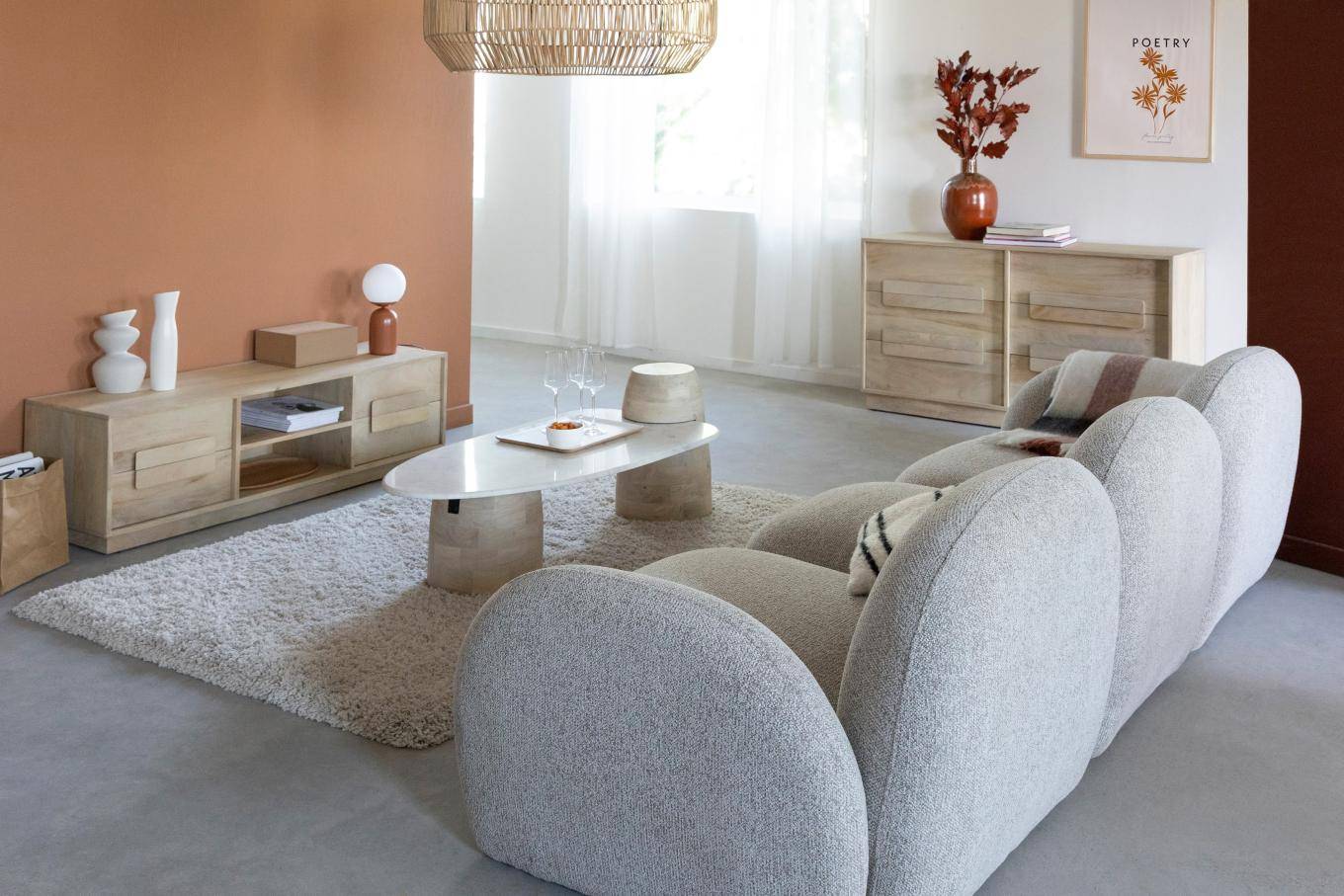 Nature sculptée++++XSalonNature sculptéeUn salon baigné de lumière, entre murs ocres et teintes sable. Le bois clair s’accorde à la douceur du tissu bouclette, le marbre illumine l’ensemble. Un espace de quiétude où matières naturelles et courbes généreuses invitent à la détente.