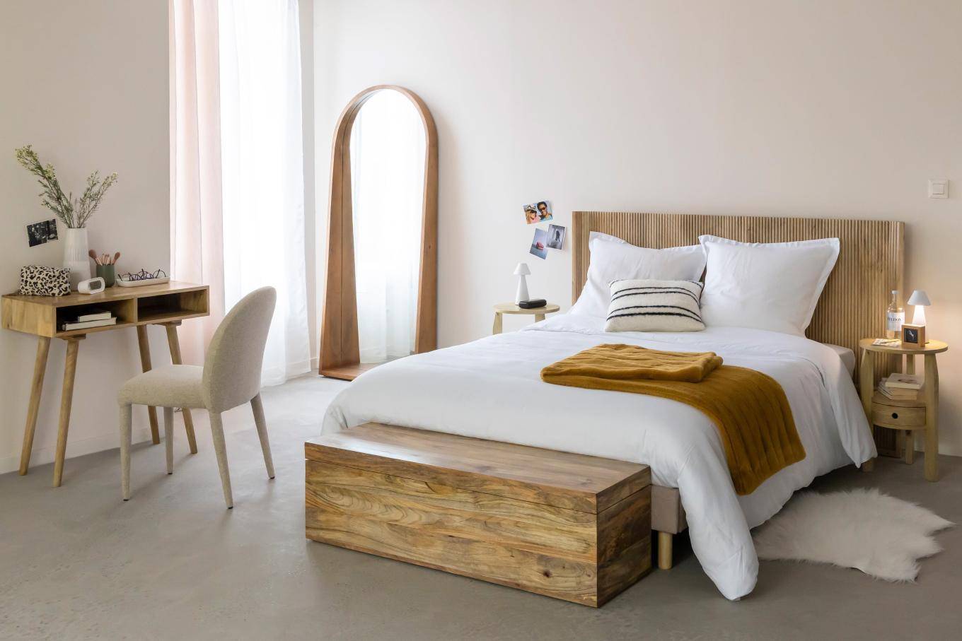 Sérénité boisée+++++XChambreSérénité boiséeUne chambre baignée de lumière où le bois blond règne en maître. La tête de lit rainurée, le bureau épuré et le banc massif composent un décor apaisant. Une touche ocre réchauffe l’ensemble, invitant au calme et à la douceur du matin.