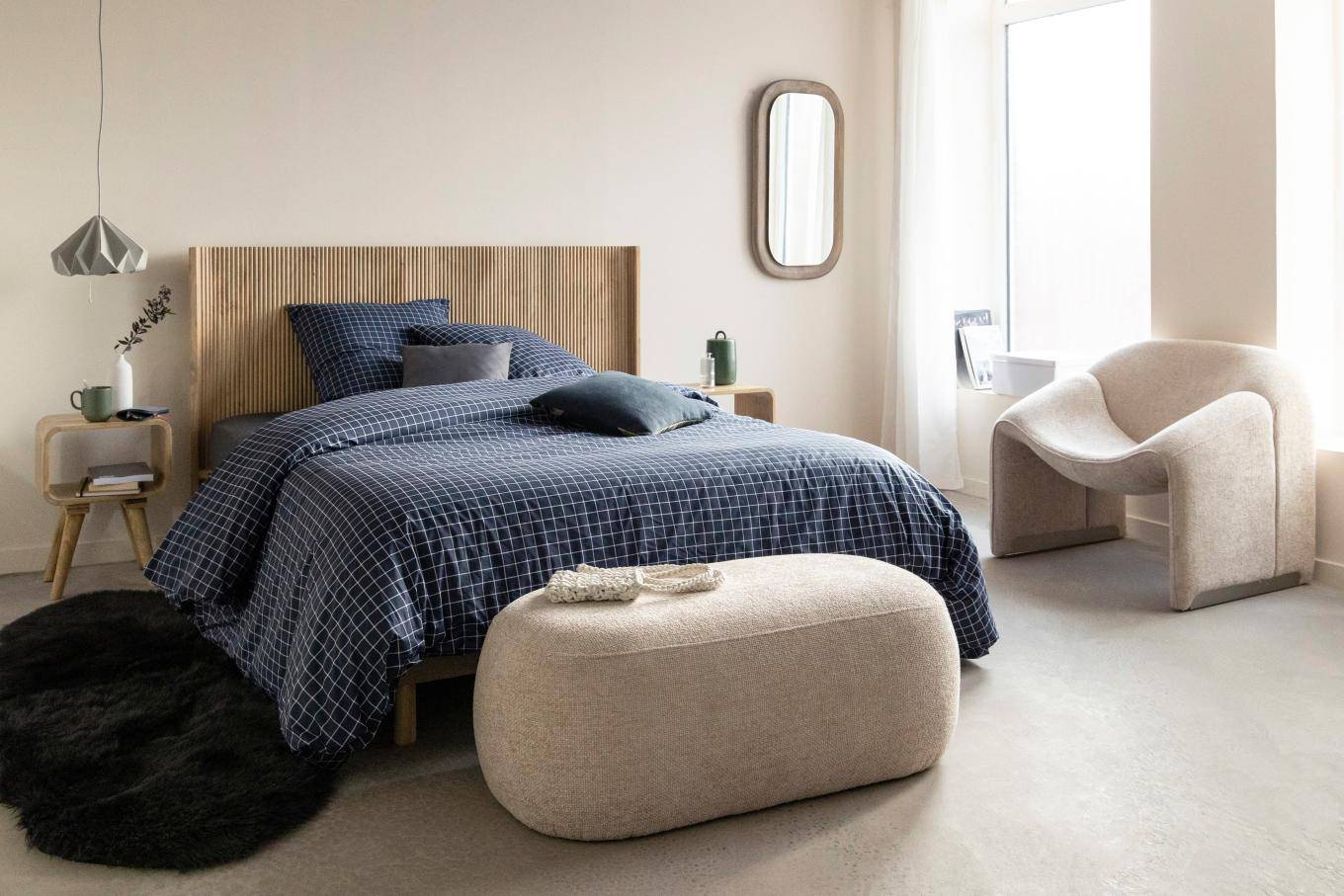 Rêve minimal+++++XChambreRêve minimalSous la douceur d’une lumière naturelle, la chambre s’apaise entre lignes épurées et teintes feutrées. Le bois clair dialogue avec la laine beige, tandis que le bleu profond du linge de lit signe un rêve minimal et apaisant.