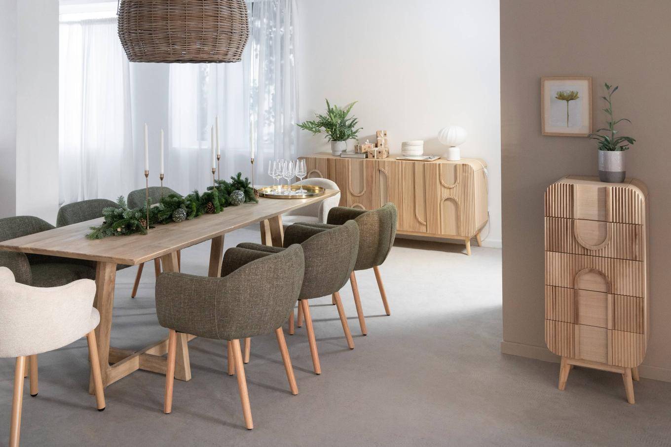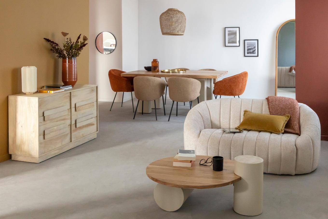 Épure Naturelle++++XSéjourÉpure NaturelleFaites entrer l’essence de la nature dans votre intérieur avec cette salle à manger aux lignes douces et organiques. La table sculpturale en bois massif, associée à des chaises aux courbes enveloppantes, offre un espace chaleureux et raffiné pour vos repas en famille ou entre amis.