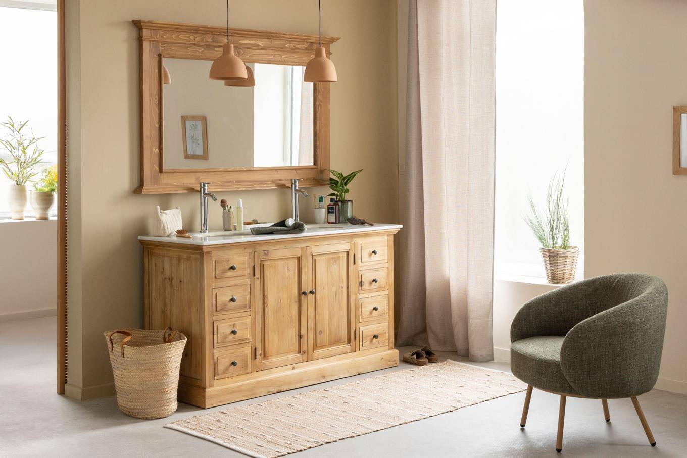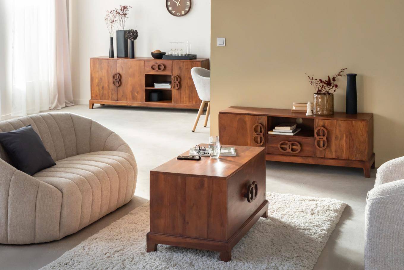 Éclat rustique++++XSéjourÉclat rustiqueLe bois recyclé révèle tout son éclat rustique dans cette pièce baignée de lumière. Buffet, armoire et table basse s’accordent en une harmonie chaleureuse, où les matières brutes et les lignes apaisantes composent un intérieur authentique et serein.